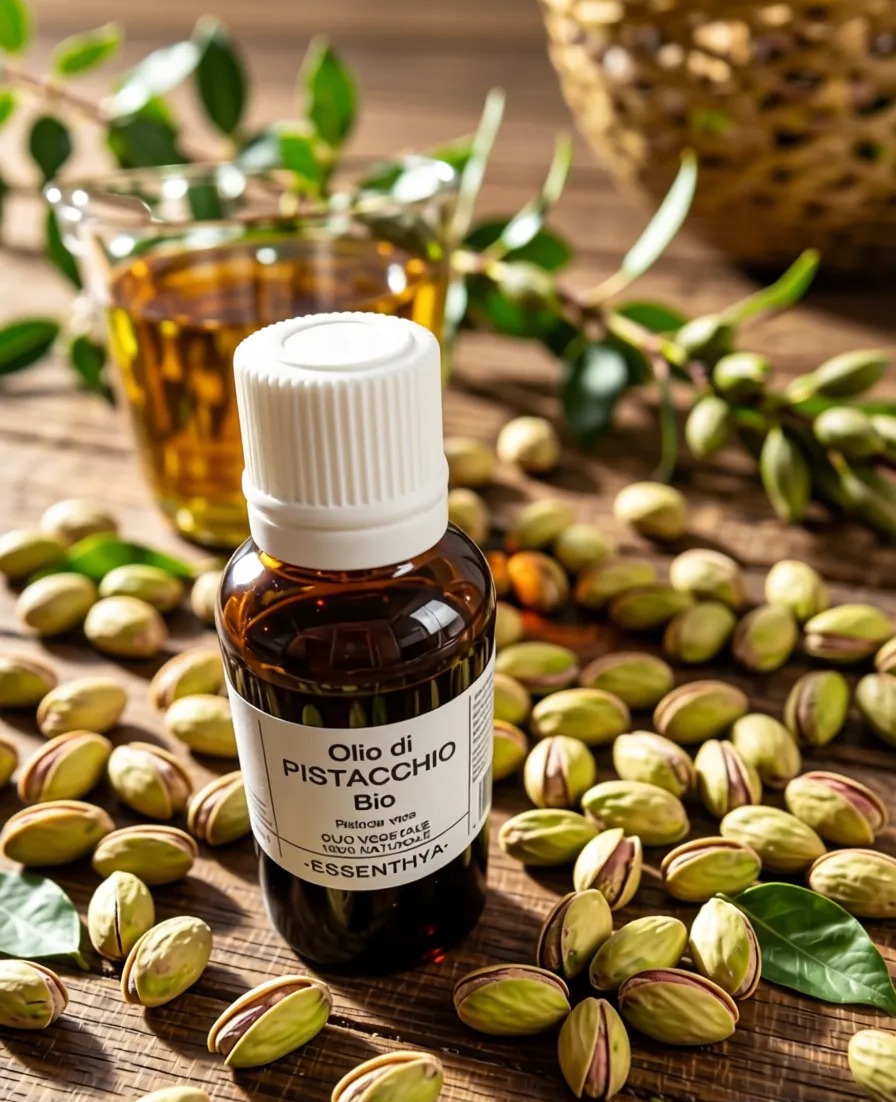 L'olio di pistacchio ESSENTHYA viene estratto utilizzando solo sistemi meccanici a temperature inferiori ai 45 °C, ottenendo un prodotto con un alto valore organolettico e nutrizionale. L'olio di pistacchio è liquido e si presenta come una sostanza oleosa di colore dal verde ambra al verde smeraldo più o meno intenso.